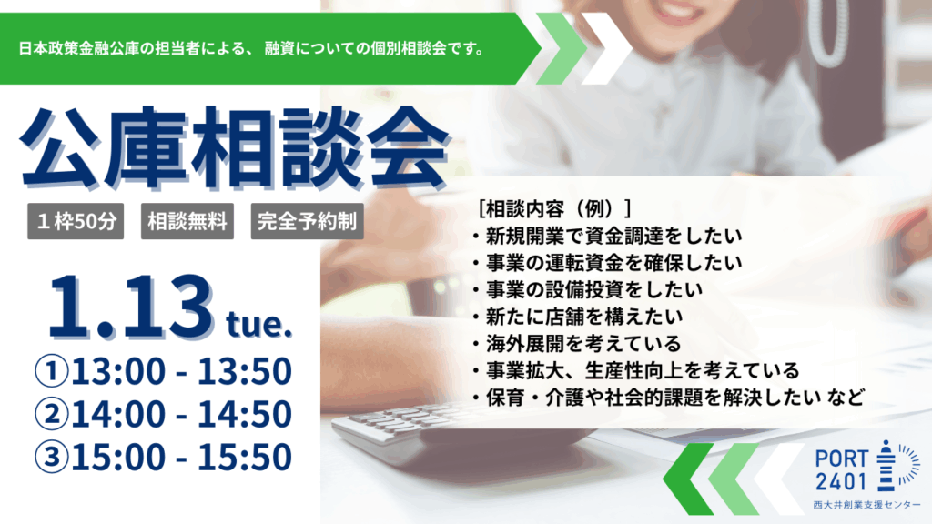 1/13(火)[個別相談会]日本政策金融公庫に融資相談ができます!