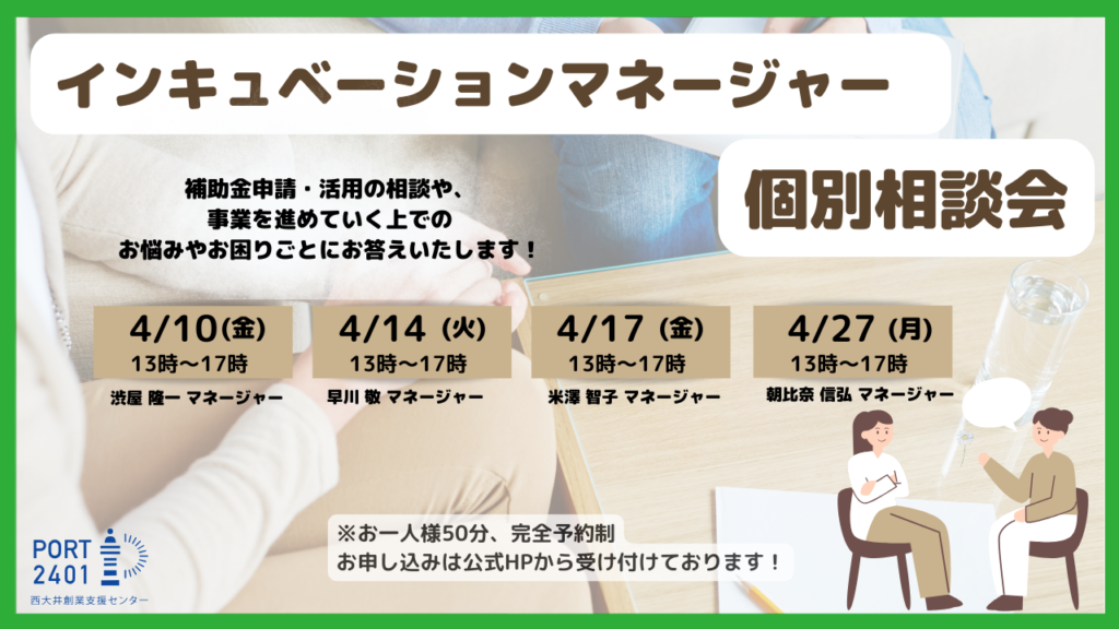 ※ZOOM、対面選択可能です。対面をご希望される方は、ご予約日時に西大井創業支援センター(https://port2401.jp/#access)までお越しください。