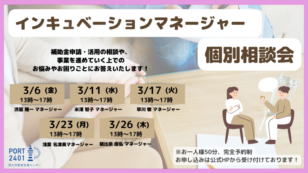 ※ZOOM、対面選択可能です。対面をご希望される方は、ご予約日時に西大井創業支援センター(https://port2401.jp/#access)までお越しください。