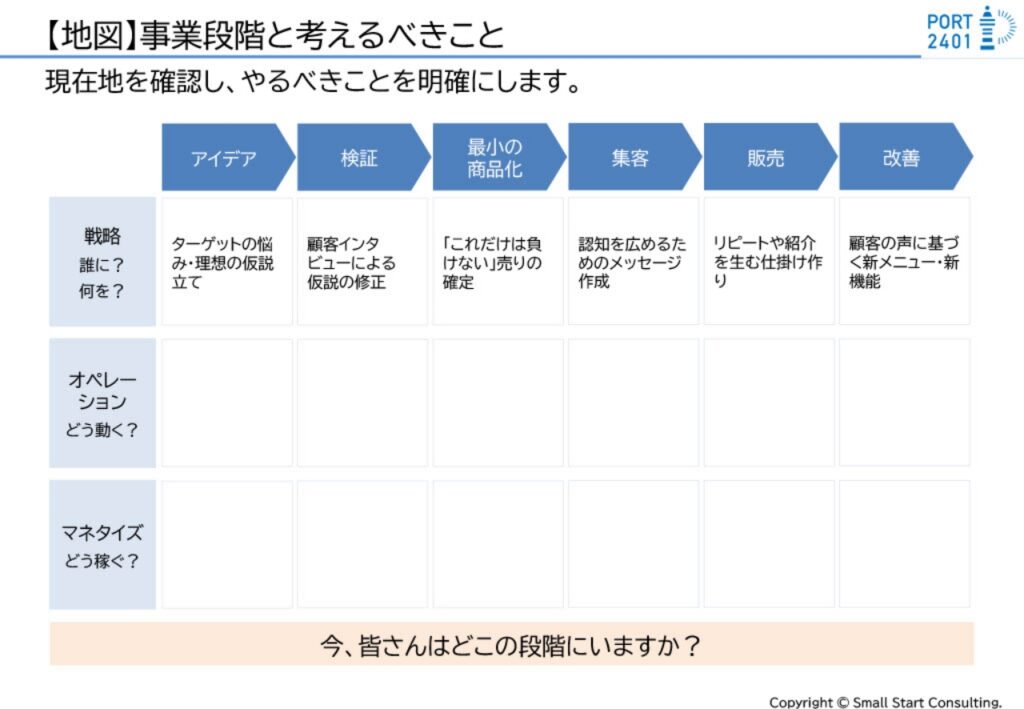 事業計画の進行サイクル(横軸)は、「アイデア」→「検証」→「最小の商品化」→「集客」→「販売」→「改善」の6段階です。
