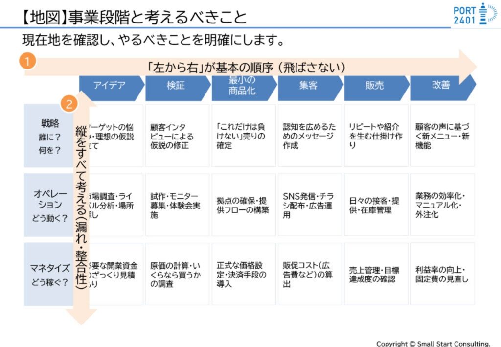これらの3要素を意識したうえで、事業計画のステップを左から右へと順に進めていきましょう。うまくいかない場合には前の段階に立ち戻り、見直しを行います。重要なのは、各ステップを飛ばさず進めること。どこかが抜け落ちると、事業計画自体に穴ができてしまいます。