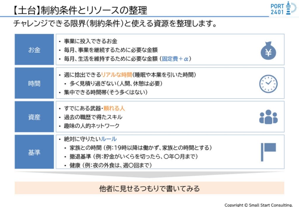 続いてのテーマは、「事業を立ち上げるにあたって、課される制約条件とは何か」です。