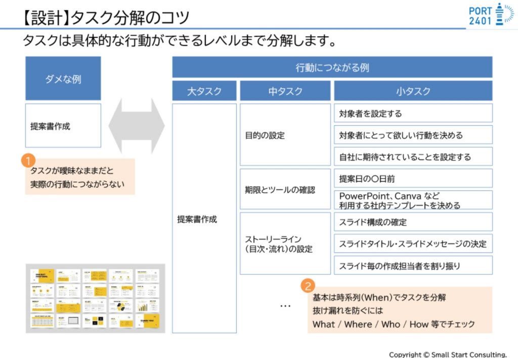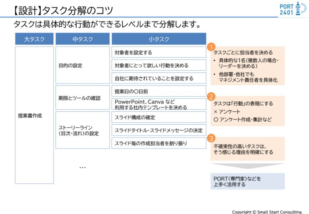 タスクを分解する際は、まずは時系列からですね。そこから「誰が担当するのか?」「いつまでに締め切りを設定するか?」なども考えます。時には専門家をうまく活用したりして、タスクを遂行していきましょう。